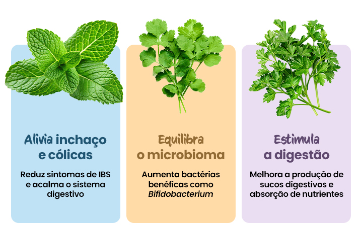 • Hortelã: Conhecida por aliviar os sintomas da síndrome do intestino irritável (IBS), como inchaço e dor abdominal (fonte: PMC/NIH). Perfeita para um chá digestivo após o jantar. Experimente a Hortelã Natura Vitacress.