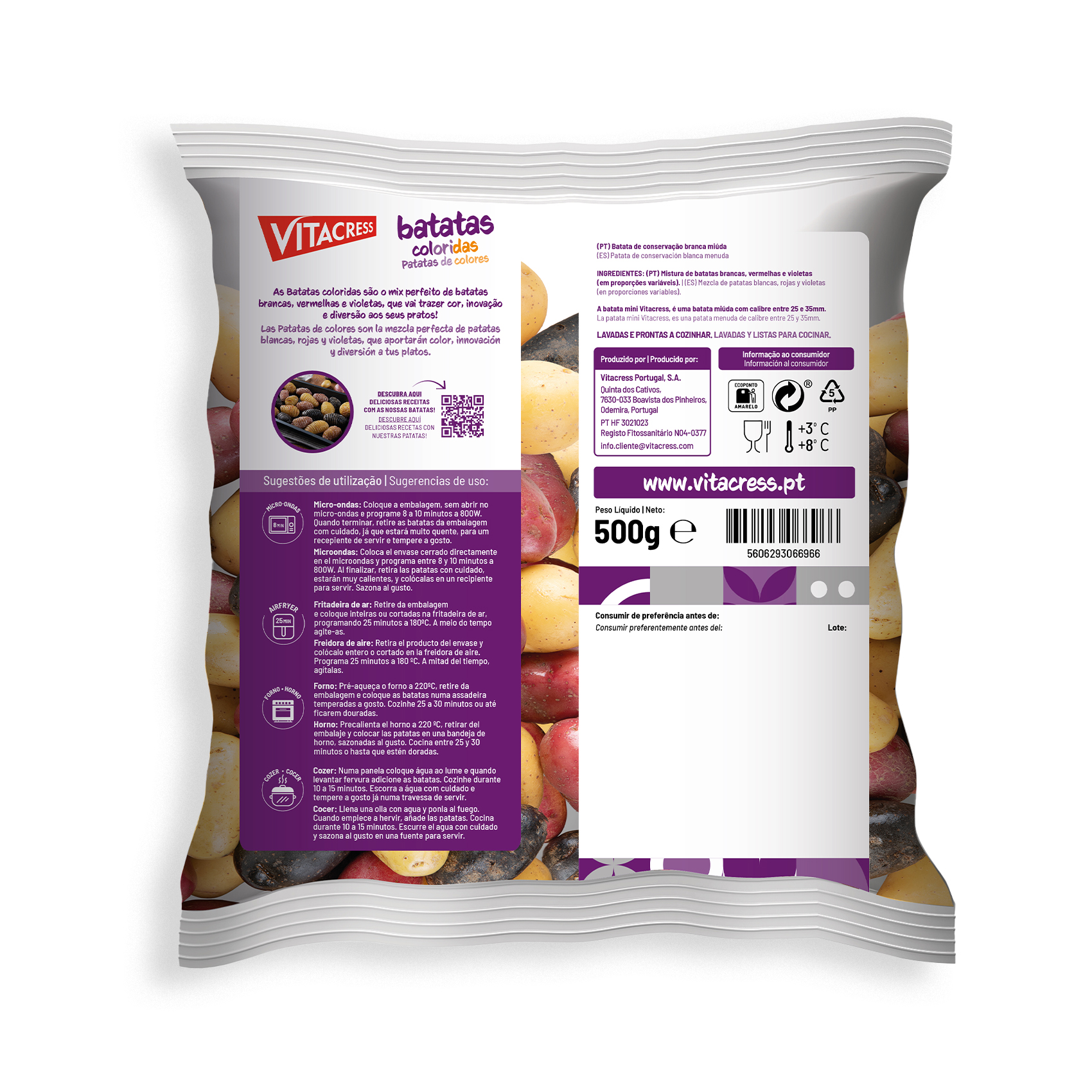 Special edition that brings together a selection of three varieties — white, red and purple potatoes — washed, graded and ready to cook.With firm flesh and natural colour, they are creamy and versatile, adapting easily to a wide range of dishes — perfect either as a side or a main course. They cook beautifully in the oven, pan, microwave or air fryer, always achieving a perfect texture.