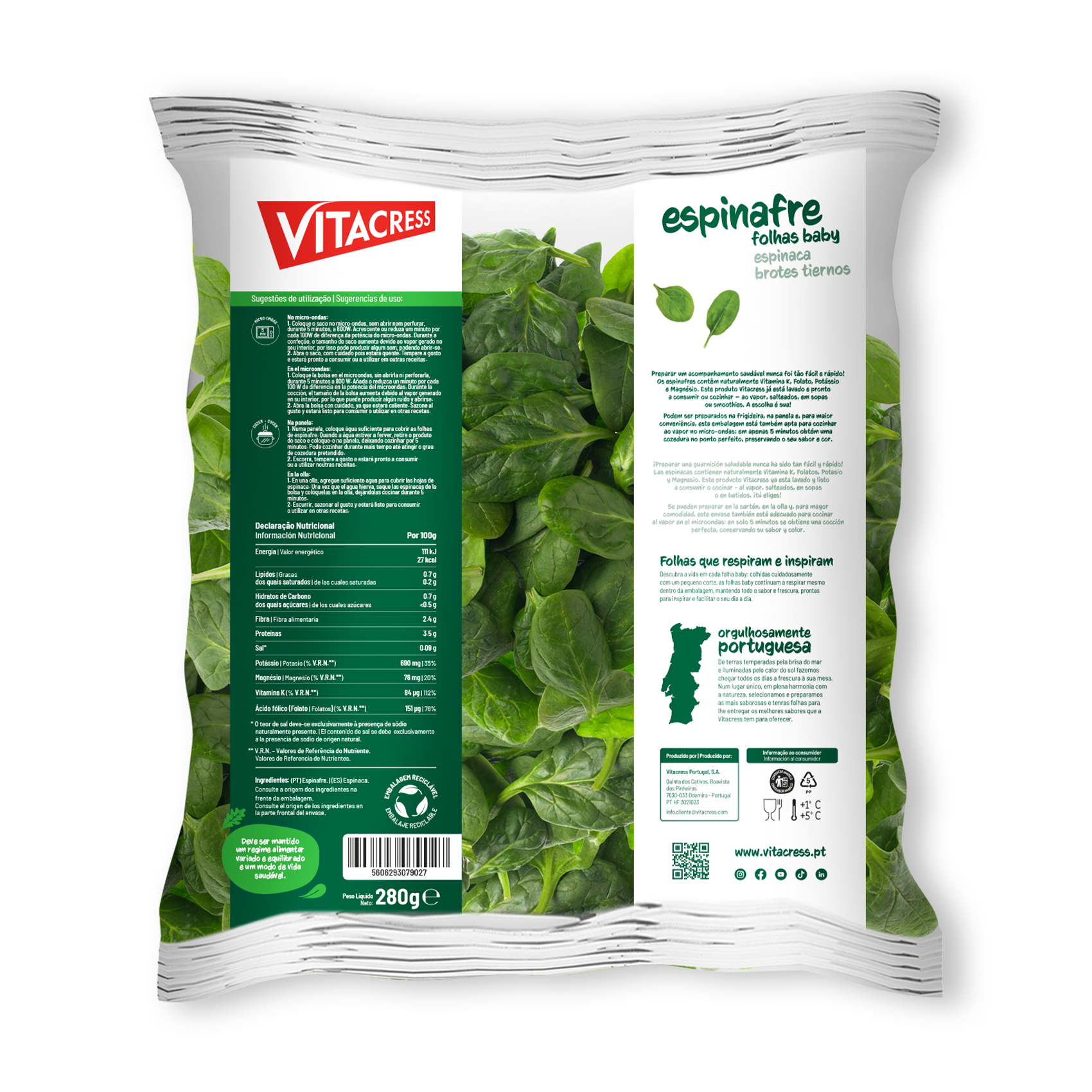 Folhas baby de espinafre de cor verde intensa, textura tenra e sabor delicado. Distinguem-se pela sua versatilidade, podendo ser consumidas cruas, em saladas, ou cozinhadas em diversas preparações.