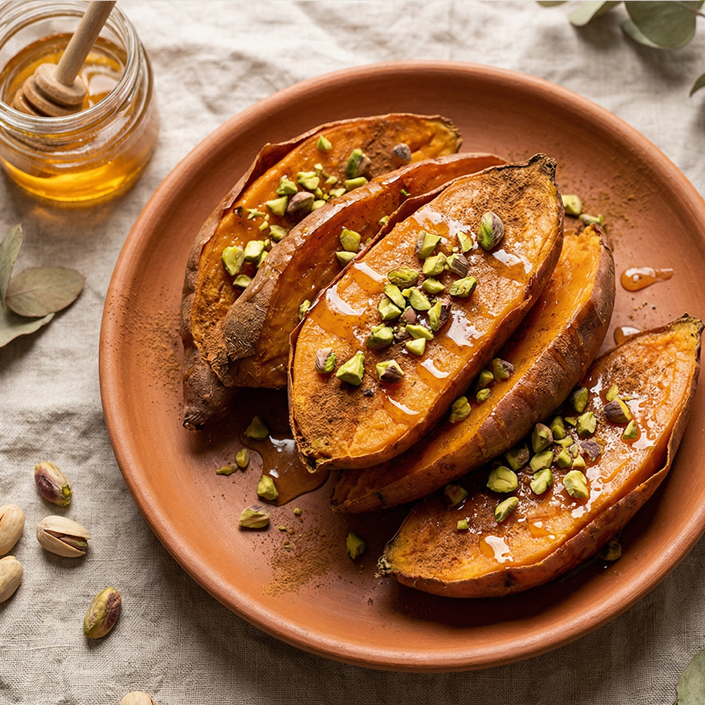 Batata Doce Assada com Mel, Canela e Pistácio
