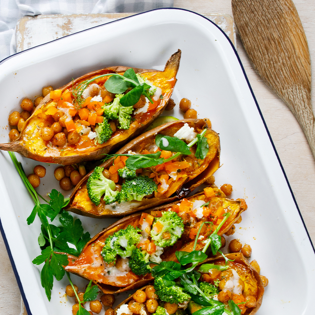 Batata-Doce Recheada com Brócolos, Grão, Salsa e Molho de Iogurte
